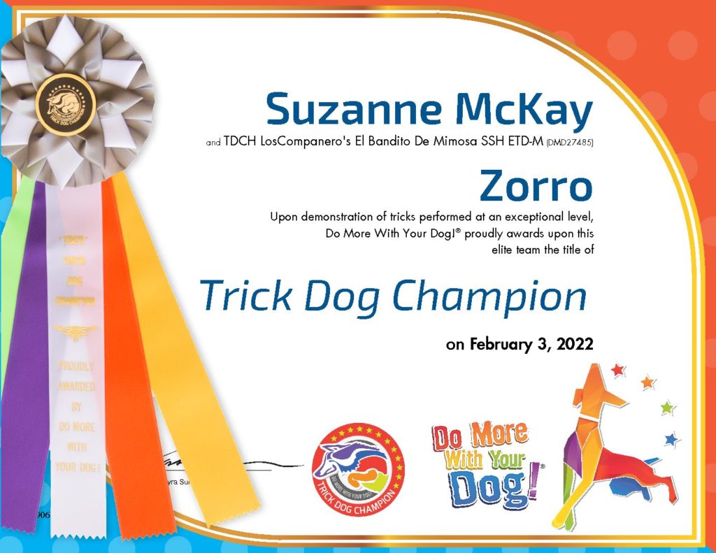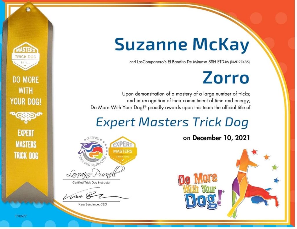 Zorro is owned and loved by Suzanne and Dave. This was a great combination as Suzanne is an excellent trainer and Zorro happened to be a very smart boy. Here is what Suzanne had written about Zorro.